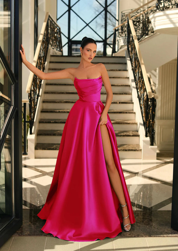 This breathtaking full-length mikado fabric dress Style Isabel boasts a ruched Strapless Boat neckline, a cinched waistline, and an A-line silhouette that flares out and is highlighted by a striking side split.