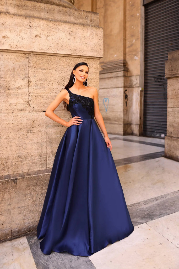 Make an unforgettable entrance in this striking one-shoulder gown.