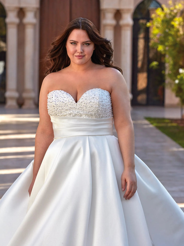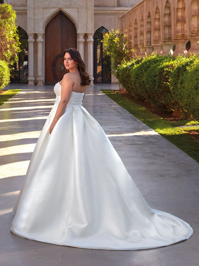 Grace the aisle in pure style in this up-to-the-minute rendition of a stunning princess classic. Tailored in luxurious Mikado, this ballgown features a beaded bodice, sweetheart neckline and asymmetrical statement sash.