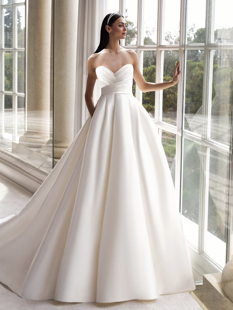 This polished princess gown is crafted in pure Mikado, featuring a carefully draped bodice with an enormous, off-the-shoulder, sleeve detail and wavy skirt of glamorous volume.
