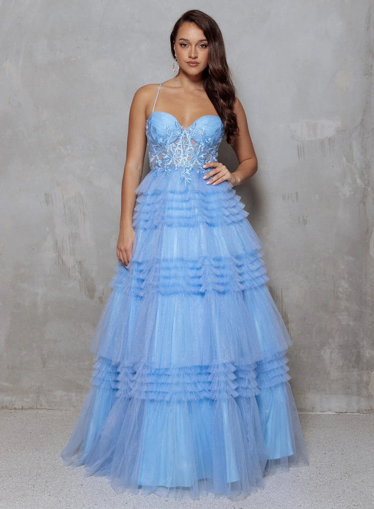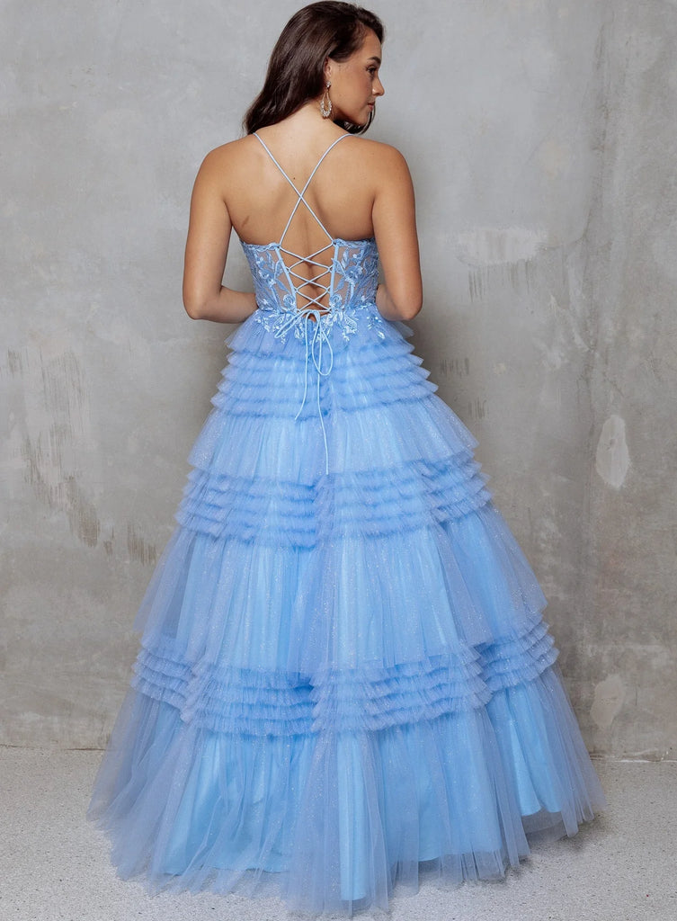 Step into your fairytale in the Rosemarie — where elegance meets enchantment. Featuring an illusion boned bodice with pleated tulle cups and delicate lace appliqué, this gown exudes soft romance. Feminine spaghetti straps and a lace-up back offer both charm and a flawless fit, while the tiered glitter tulle A-line skirt brings a dreamy, whimsical finish. Perfect for the girl who loves a touch of magic.