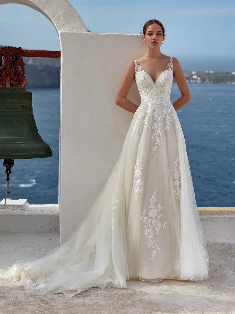 Fall in love with the romantic elegance of the Azores gown by Nicole Milano. This timeless A-line wedding dressfeatures layers of soft champagne tulle, beautifully accented with floral lace inserts that add delicate texture and dimension.