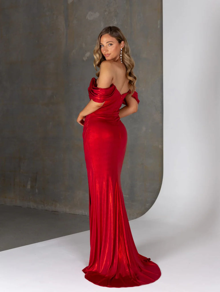 The Beryl gown is your go-to for formals, graduations, and black-tie weddings. Crafted from luxe jersey, it hugs the figure with a V-neck front and back, romantic off-the-shoulder straps, and a flowing skirt with a daring high split. Complete with built-in cups and an invisible zip for comfort and polish.