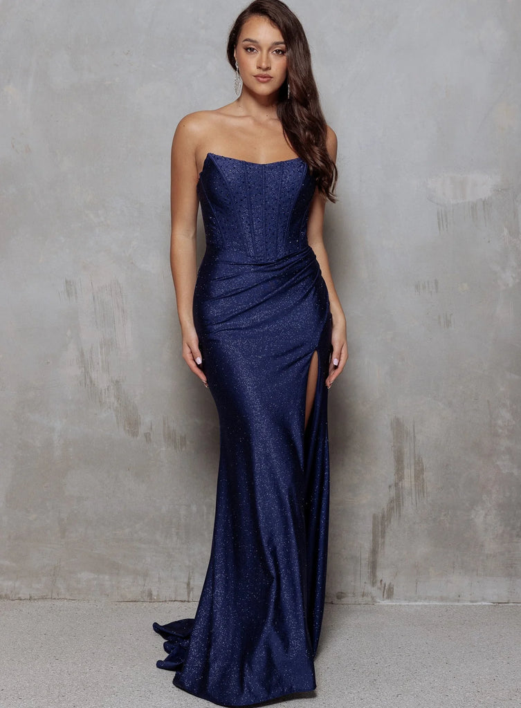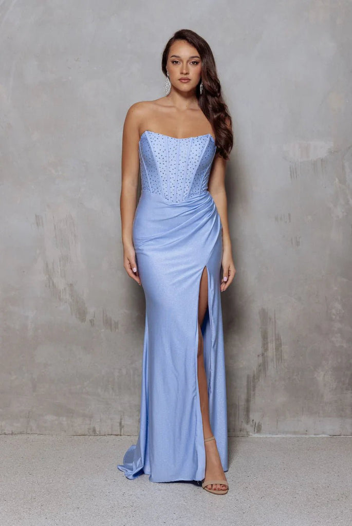 Make an entrance in the Fleurette — where sleek meets show-stopping. This strapless beauty stuns with peaked cups that frame the décolletage, a corset bodice that sculpts your shape, and a daring thigh-high split for added drama. The lace-up back ensures the perfect fit, while the rhinestone-studded jersey fabric sparkles with every step. Fleurette isn’t just a dress — it’s a moment.