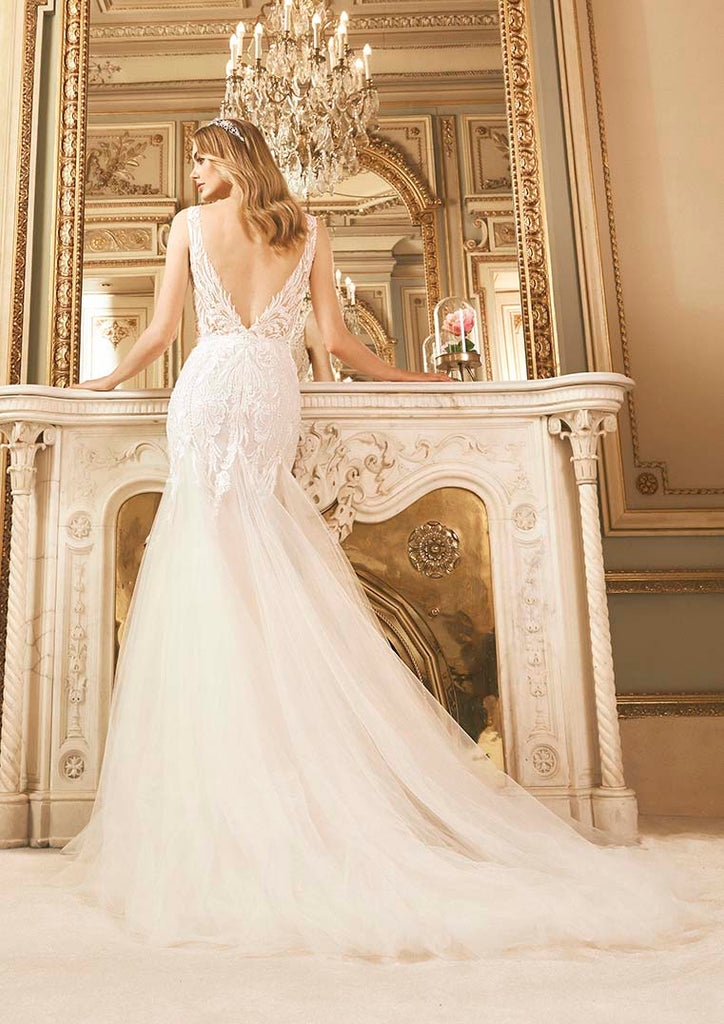Designed for the modern bride, this fitted mermaid gown combines clean lines with delicate detail. The body-hugging silhouette flows into a soft, layered tulle skirt that adds volume through the train—creating a flattering shape that elongates and enhances.