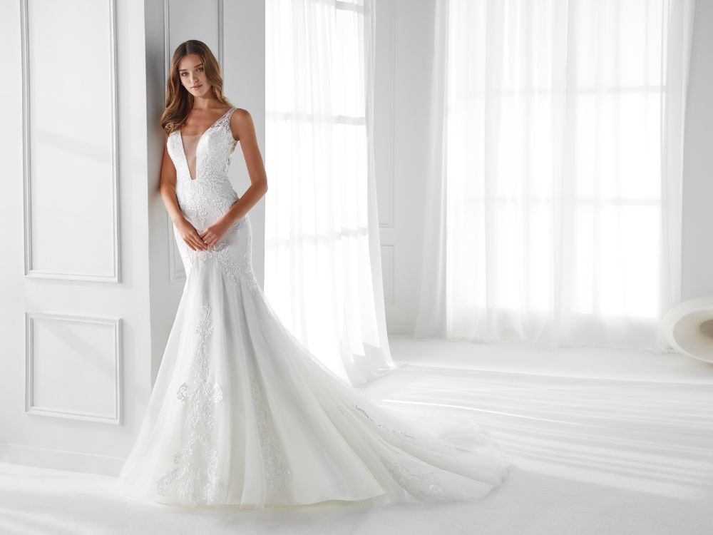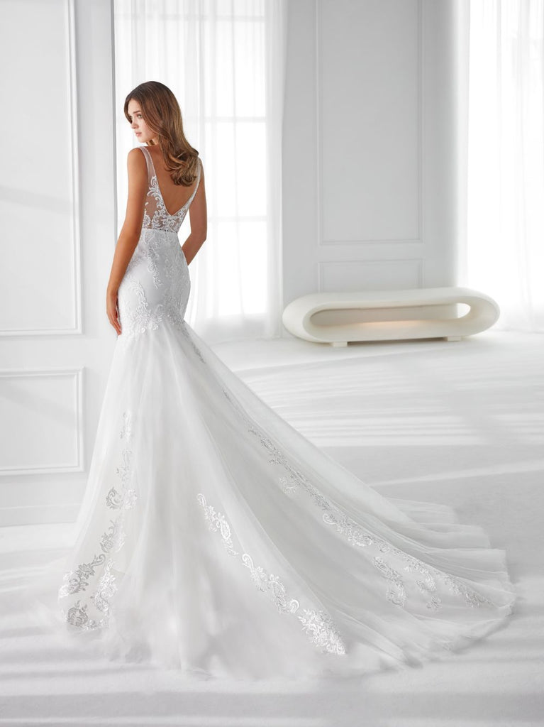 Aurora AU12104 is an alluring semi-mermaid gown designed to highlight the natural beauty and grace of the modern bride. Crafted in soft tulle and allover lace, this gown features a silhouette that gently hugs the figure before flowing into a delicate flare—creating an effortlessly feminine and youthful look.